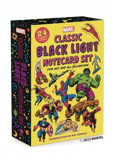 The Marvel Super Heroes are together again! First published in 1971 by Marvel Comics and famed novelty publisher the Third Eye, Inc., the original Marvel black light notecard series have never been reproduced in full, until now. Printed in fluorescent inks on high-quality paper, this deluxe collector's set features 24 full-scale reproductions of the original notecards and all their day-glow glory. Fans will light up with this deluxe, collectible notecard set featuring 24 black-light images of celebrated Marvel Comics characters, including Spider-Man, Captain Marvel, Thor, and the Hulk, illustrated by legendary artists Jack Kirby, John Romita Sr., Gene Colan, and others. Each card measures 6' wide x 9 1/4' high.