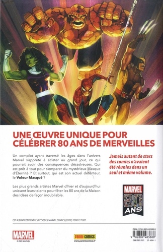 Chacune des 80 pages de Marvel Comics 1 000 évoque l'une des 80 années écoulées depuis la création de la Maison des Idées. Outre les héros Marvel, on retrouve Conan le Barbare, Dark Vador et Miracleman. Le récit bonus Marvel Comics 1 001 est également inclus. 80 ans après Marvel Comics 1, Marvel propose un numéro 1 000 incroyable. 80 équipes créatives exceptionnelles revisitent l'histoire de la Maison des Idées à travers un récit imaginé par Al Ewing qui dévoile les mystères du Masque d'Eternité. Retrouvez Neil Gaiman, Alex Ross, Walt Simonson, Erik Larsen, Jason Latour, Jeph Loeb, J. Michael Straczynski, John Cassaday, Mike Allred, les époux Immonen, Kareem Abdul-Jabbar, Jim Cheung, Gail Simone, les réalisateurs de Spider-Man : New Generation, Mike Deodato Jr, Charles Soule, Mark Waid et des dizaines d'autres créateurs pour le projet le plus ambitieux de l'histoire des comics.