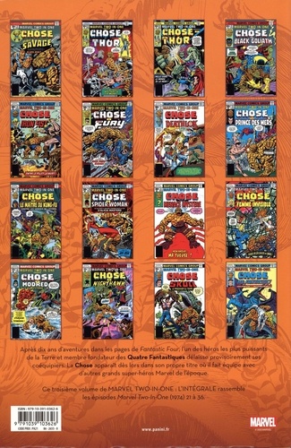 Lors d'un dangereux voyage dans l'espace, quatre aventuriers américains sont exposés à des rayons cosmiques qui les dotent d'incroyables pouvoirs. Le pilote, Ben Grimm, se transforme en un colosse de pierre et adopte le surnom de la Chose au sein de l'équipe des Quatre Fantastiques. Après dix ans d'aventures dans les pages de la série Fantastic Four, la Chose apparaît dans son propre titre, le bimestriel Marvel Two-In-One. Tous les deux mois, il s'allie à un autre super-héros pour tenter d'écarter de terribles dangers. La série suit son cours entre 1976 et 1978, avec Bill Mantlo et Mary Wolfman au scénario, tandis que se succèdent, pour la partie graphique, Ron Wilson, Ernie Chan et les frères Sal et John Buscema.