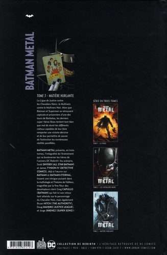 Les Chevaliers Noirs contre la Ligue de Justice : le Multivers contre le Multivers Noir. Alors que Batman et Superman se retrouvent capturés et prisonniers d'une des tours de Barbatos, les derniers super-héros libres tentent tant bien que mal de réunir les différents métaux capables de leur assurer une victoire décisive et de leur permettre de sauver de l'extinction les nombreuses réalités parallèles.