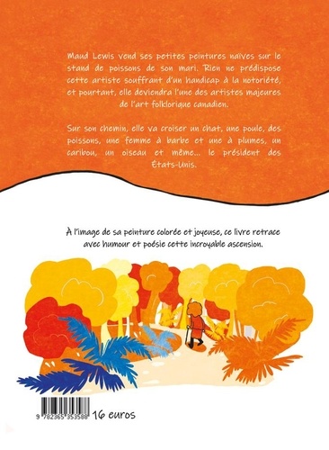 Construit sur le mode de planches à chutes, cette BD retrace l'ascension de la peintre Maud Lewis (1901-1970). Si le handicap et la résilience se lisent en filigrane, les auteurs veulent avant tout mettre en avant l'univers pittoresque et coloré de cette artiste hors norme. Quel parcours ! Maud Lewis vit au Canada avec son mari Everett, marchand de poissons, dans une maison minuscule. Alors qu'elle peine à faire des tâches quotidiennes, elle s'épanouit dans la peinture naïve , elle peint sur tous supports, du carton, des objets, et même les murs de sa maison. Un peu malgré elle, elle devient progressivement reconnue dans le monde de l'art. Le président Richard Nixon fait même l'acquisition d'une toile pour la Maison blanche. Un portrait aux couleurs joyeuses, de la naïveté, de l'empathie, de la poésie et un vernis d'humour.