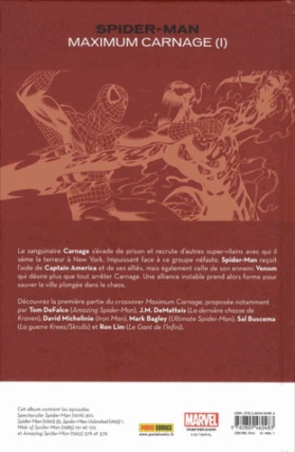 Le sanguinaire Carnage s'évade de prison et recrute d'autres super-vilains avec qui il sème la terreur à New York. Impuissant face à ce groupe néfaste, Spider-Man reçoit l'aide de Captain America et de ses alliés, mais également celle de son ennemi Venom qui désire plus que tout arrêter Carnage. Une alliance instable prend alors forme pour sauver la ville plongée dans le chaos. Découvrez la première partie du crossover Maximum Carnage, proposée notamment par Tom DeFalco (Amazing Spider-Man), JM DeMatteis (La dernière chasse de Kraven), David Michelinie (Iron Man), Mark Bagley (Ultimate Spider-Man), Sal Buscema (La guerre Krees/Skrulls) et Ron Lim (Le Gant de l'Infini).