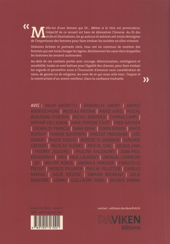 Méfie-toi d'une femme qui lit... Même si le titre est provocateur, l'objectif de ce recueil est bien de démontrer l'inverse. Au fil des récits et illustrations, les 42 auteurs et autrices ont voulu témoigner de l'importance des femmes pour faire évoluer les sociétés où elles vivaient. Histoires fictives et portraits réels, tous ont en commun de montrer des femmes qui ont voulu bouger les lignes, décloisonner les cases dans lesquelles les hommes les avaient cantonnées. Au-delà de ces combats portés avec courage, détermination, intelligence et sensibilité, toutes se sont battues pour l'égalité des chances, pour faire évoluer les regards et permettre ainsi à l'humanité d'avancer sans considération de races, de genres ou de religions. Au nom de ce qui nous relie tous : l'espoir et la construction d'un avenir meilleur. Dans la confiance mutuelle.
