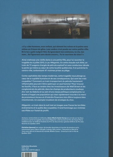 Ainsi s'adresse une vieille dame à une petite fille, pour lui raconter la tragédie du 6 juillet 2013, à Lac-Mégantic. En cette chaude nuit d'été, un train de 72 wagons chargés de pétrole explosif et sans conducteur dévale la pente qui mène au coeur de cette localité québécoise. Il en pulvérise le centre-ville, carbonisant 47 victimes prises au piège. Conte capitaliste des temps modernes, cette tragédie nous plonge au coeur de la cupidité humaine et de ses conséquences. Qui sont les vrais coupables ? Comment un train transportant du pétrole hautement inflammable pouvait-il être opéré par un seul homme ? Pour trouver les fautifs, il faut se rendre chez les investisseurs de Wall Street et les conglomérats du pétrole, dans les champs de producteurs cowboys d'or noir du Dakota et au sein d'une classe politique complaisante. Le drame a frappé une population qui s'est rapidement trouvée à la merci de promoteurs locaux et d'intérêts financiers loin d'être toujours bien intentionnés. Un exemple troublant de stratégie du choc. Mégantic, un train dans la nuit met en images avec fracas les terribles événements et la quête des coupables. Il rend hommage aux victimes sacrifiées sur l'autel du profit.