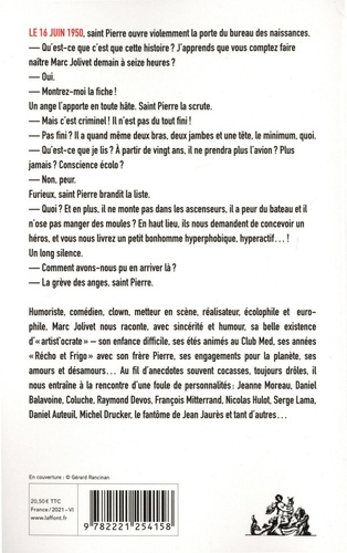 Les mémoires sensibles et décalés d'un utopitre Le 16 juin 1950, saint Pierre ouvre violemment la porte du bureau des naissances. - ; Qu'est-ce que c'est que cette histoire ? J'apprends que vous comptez faire naître Marc Jolivet demain à seize heures ? - ; Oui. - ; Montrez-moi la fiche ! Un ange l'apporte en toute hâte. Saint Pierre la scrute. - ; Mais c'est criminel ! Il n'est pas du tout fini ! - ; Pas fini ? Il a quand même deux bras, deux jambes et une tête, le minimum, quoi. - ; Qu'est-ce que je lis ? A partir de vingt ans, il ne prendra plus l'avion ? Plus jamais ? Conscience écolo ? - ; Non, peur. Furieux, saint Pierre brandit la liste. - ; Quoi ? Et en plus, il ne monte pas dans les ascenseurs, il a peur du bateau et il n'ose pas manger des moules ? En haut lieu, ils nous demandent de concevoir un héros, et vous nous livrez un petit bonhomme hyperphobique, hyperactif... ! Un long silence. - ; Comment avons-nous pu en arriver là ? - ; La grève des anges, saint Pierre. Humoriste, comédien, clown, metteur en scène, réalisateur, écolophile et europhile, Marc Jolivet nous raconte, avec sincérité et humour, sa belle existence d'" artist'ocrate " - son enfance difficile, ses étés animés au Club Med, ses années " Récho et Frigo " avec son frère Pierre, ses engagements pour la planète, ses amours et désamours... Au fil d'anecdotes souvent cocasses, toujours drôles, il nous entraîne à la rencontre d'une foule de personnalités : Jeanne Moreau, Daniel Balavoine, Coluche, Raymond Devos, François Mitterrand, Nicolas Hulot, Serge Lama, Daniel Auteuil, Michel Drucker, le fantôme de Jean Jaurès et tant d'autres...