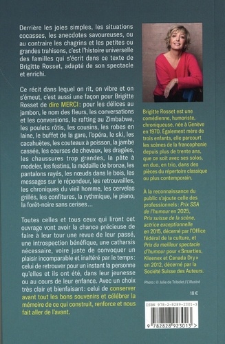 Derrière les joies simples, les situations cocasses, les anecdotes savoureuses, ou au contraire les chagrins et les petites ou grandes trahisons, c'est l'histoire universelle des familles qui s'écrit dans ce texte de Brigitte Rosset, adapté de son spectacle et enrichi. Ce récit dans lequel on rit, on vibre et on s'émeut, c'est aussi une façon pour Brigitte Rosset de dire MERCI : pour les délices au jambon, le nom des fleurs, les conversations et les conversions, le rafting au Zimbabwe, les poulets rôtis, les cousins, les robes en laine, le buffet de la gare, l'opéra, le ski, les cacahuètes, les couteaux à poisson, la jambe cassée, les courses de chevaux, les dragées, les chaussures trop grandes, la pâte à modeler, les festins, la médaille de bronze, les pantalons rayés, les noeuds dans le bois, les messages sur le répondeur, les retrouvailles, les chroniques du vieil homme, les cervelas grillés, les confitures, la rythmique, le piano, la forêt-noire sans cerises... Toutes celles et tous ceux qui liront cet ouvrage vont avoir la chance précieuse de faire à leur tour une revue de leur passé, une introspection bénéfique, une catharsis nécessaire, voire juste de convoquer un plaisir incomparable et inaltéré par le temps : celui de retrouver pour un instant la personne qu'elles et ils ont été, dans leur jeunesse ou au cours de leur enfance. Avec un choix très clair et bienfaisant : celui de conserver avant tout les bons souvenirs et célébrer la mémoire de ce qui construit, renforce et nous fait aller de l'avant.