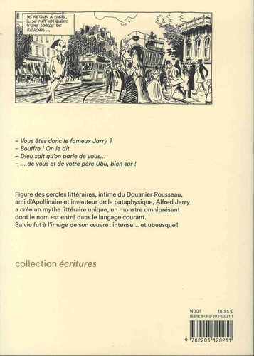 Vous êtes donc le fameux Jarry ? Bouffre ! On le dit. Dieu sait qu'on parle de vous... ... de vous et de votre père Ubu, bien sûr ! Figure des cercles littéraires, intime du Douanier Rousseau, ami d'Apollinaire et inventeur de la pataphysique, Alfred Jarry a créé un mythe littéraire unique, un montre omniprésent dont le nom est entré dans le langage courant. Sa vie fut à l'image de son oeuvre : intense... et ubuesque !
