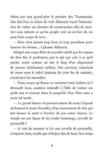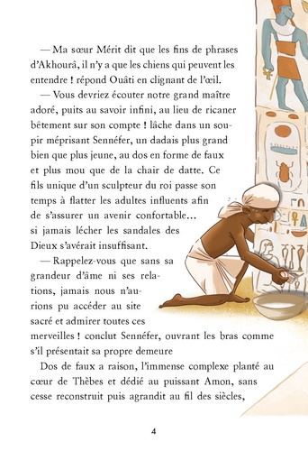 Une aventure fantastique au temps des Pharaons. Dans l'Egypte du 15e siècle avant J. C, la jeune Mérit et son petit frère Ouâti prennent tous les risques afin de libérer la fille d'un dieu maudit, retenue prisonnière dans une salle secrète au coeur du temple d'Amon. Voyage sur le Nil, rencontres étonnantes, visites de lieux hors du commun, l'enquête de Mérit et Ouâti les conduit dans le nord du pays, jusqu'au palais royal d'Avaris, avec comme seul indice un mystérieux hiéroglyphe représentant un taureau. Les aventures de Mérit et Ouâti offrent un plongeon dans la vie quotidienne des Egyptiens de cette époque. L'info en + : Ce roman est richement illustré par Nathalie Janer, auteur jeunesse d'une trentaine d'ouvrages, et écrit par Christophe Cazenove, scénariste des Sisters et des Petits Mythos, tous deux accompagnés par Amandine Marshall, docteur en Egyptologie, conseillère scientifique auprès de France Télévisions et conceptrice de ToutankaTube et NefertiTube, chaînes d'égyptologie sur le net.