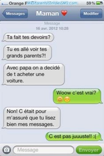 Après le succès de Vie de Merde, le site « Mes Parents font des SMS » est en train de devenir la nouvelle tendance du web ! Il rassemble un florilège des messages les plus insolites que les parents envoient à leurs enfants par textos. Quand les parents ne comprennent pas comment faire un SMS ou quand ils ne savent pas vraiment utiliser les expressions courantes, de drôles de conversations peuvent se produire et donnent lieu à des SMS maladroits, loufoques, fous, ou tout simplement hilarants !
