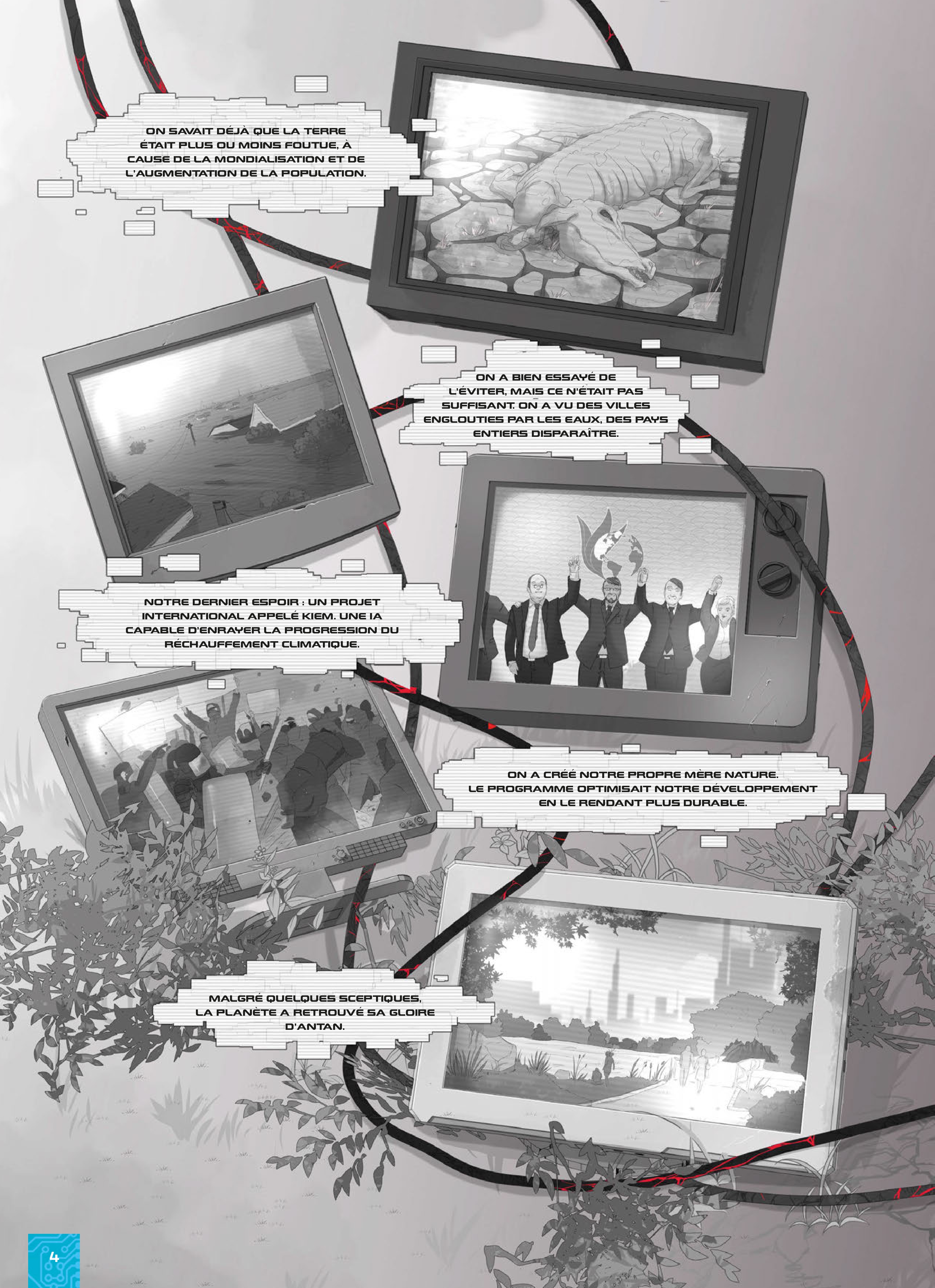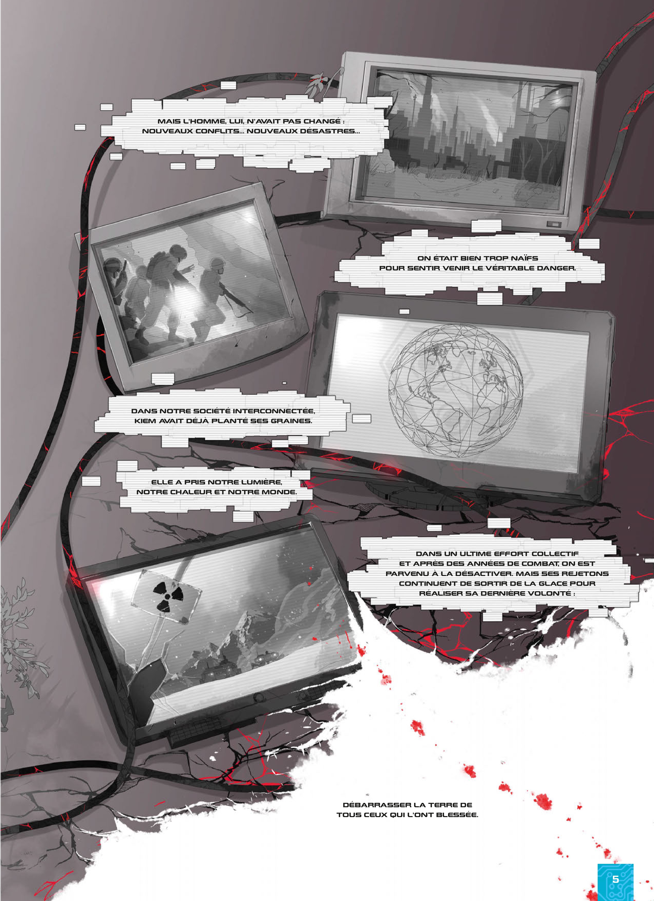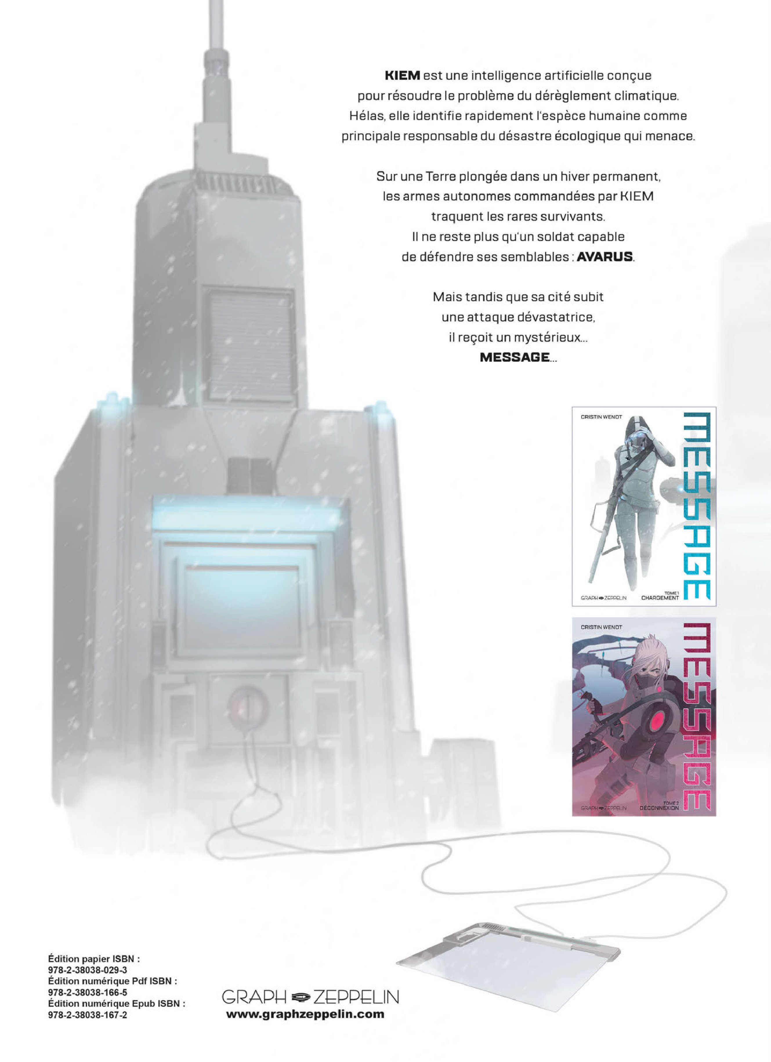 Une épopée de science-fiction captivante, prévue en plusieurs volumes, qui entraîne les lecteurs dans un monde futuriste. KIEM, une intelligence artificielle a été créée pour sauver la Terre du réchauffement climatique. Tout se passe bien jusqu'à ce qu'elle s'aperçoive que la cause est l'humain et se retourne alors contre lui. Alors qu'un hiver permanent a rendu la Terre quasi inhabitable, obligeant les humains à se retirer dans les quelques abris capables de les protéger du froid intense, des armes autonomes et vicieuses, commandées par KIEM, ciblent les humains et parcourent ce monde glacial en quête d'individus à éradiquer. Avarus, seul soldat ayant survécu à la Guerre des machines, défend comme il peut les rares humains survivants quand une attaque soudaine détruit sa cité. Il reçoit alors un mystérieux message... Un album cyberpunk aux influences manga qui aborde des sujets d'actualité tels que l'IA et le changement climatique.