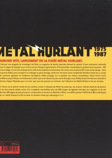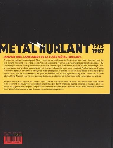 JANVIER 1975, LANCEMENT DE LA FUSEE METAL HURLANT. Créé par une poignée de transfuges de Pilote, ce magazine de bande dessinée devient le vecteur d'une révolution culturelle sous le règne de laquelle nous vivons encore. Plusieurs générations d'Humanoïdes s'assemblent et jettent leurs passions - BD franco-belge, comics US, underground, cinéma-bis, littérature fantastique, SF, roman noir, érotisme SM, rock, mode, design - dans ce grand shaker pour produire un mélange au goût étrange, carburant de toute notre modernité. Pendant treize ans, à coups de numéros spéciaux et d'éditions étrangères, Métal propage sur la planète ses visions incendiaires. Cette French touch soufflera jusqu'àTokyo ou Hollywood, si bien que trois décennies plus tard, George Lucas, Ridley Scott,Tim Burton, Katsuhiro Otomo, Hayao Miyazaki, pour ne citer que ceux-là, peuvent se réclamer de l'influence de Métal Hurlant et de ses artistes. A l'heure où le phénix renaît de ses cendres, revoici l'odyssée de Métal racontée par ses acteurs mêmes, illustrée de photos et de documents inédits, suivie d'un scrapbook rassemblant plus de 600 images de légende extraites du magazine et de ses dérivés. 300 pages de joie pure pour comprendre comment La Machine à Rêvera modifié à jamais l'ADN de la BD, l'esthétique du XXe siècle finissant et fait se lever le tsunami visuel qui submerge le XXIe siècle.