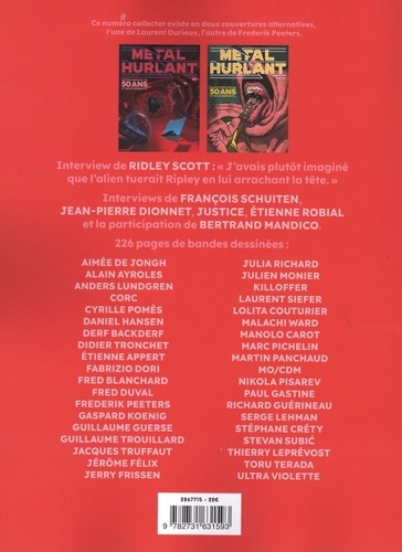 Interview de Ridley Scott : " J'avais plutôt imaginé que l'alien tuerait Ripley en lui arrachant la tête." Interviews de Francois schuiten, Jean-Pierre Dionnet, Justice, Etienne Robial et la participation de Bertrand Mandico.