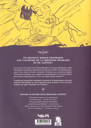 La première BD de l'autrice de La Servante écarlate ! Par une nuit noire, un jeune ingénieur en génétique est accidentellement muté par sa propre expérience lorsque son ADN est fusionné avec celui d'un chat et d'un hibou ! Devenu une créature hybride, il peut désormais voler et voir dans le noir, mais a aussi une fâcheuse tendance à dormir le jour et à manger des souris ou des petits oiseaux vivants. Nouvelles aptitudes, nouvelles habitudes, pour le meilleur et pour le pire... comment va-t-il gérer cette soudaine transformation ? Angel Catbird est la première bande dessinée scénarisée par la romancière Margaret Atwood ! L'autrice du chef-d'oeuvre La Servante écarlate- qu'on a récemment découvert à travers l'adaptation remarquée en série TV The Handmaid's Tale- joue de sa merveilleuse écriture avec les codes du comics pour nous livrer une aventure enlevée, pleine de rebondissements et d'humour, qui brosse des thématiques aussi vastes et profondes que le dépassement de soi, l'éthique scientifique, la tolérance et l'amour.
