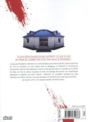 "A quoi bon essayer de me justifier ? Ce que je suis en train de commettre n'est pas un acte rationnel." Un groupe d'étudiants, membres d'un club d'amateurs de romans policiers, part en vacances sur l'île de Tsunojima. Ils vont résider dans le Décagone, un bâtiment à l'architecture surprenante créé par Seiji Nakamura, mort six mois plus bât dans un incendie sur la même île. Mais une fois sur place, le groupe va faire une étrange découverte : de mystérieuses plaquettes où figurent les mots "victime", "détective" et "coupable" semblent leur être destinées. Au même moment, une autre étudiante, ex-membre de ce club reçoit une lettre... de la part du mort. Une double enquête commence alors...