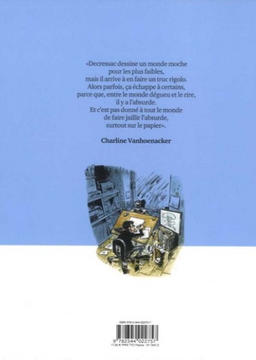 Riez, c'est bon pour la santé ! L'Echo des savanes, mythique revue satirique, accueille depuis près de 50 ans la fine fleur du dessin d'humour. L'académie du mauvais esprit et de la blague marrante dont Decressac forme l'un des plus éminents représentants. En blagues dessinées ou en dessins d'humeur, son trait aussi précis qu'impitoyable n'épargne rien ni personne. Religieux, militaires, politiques, terroristes, femmes, beaufs, patrons, banquiers, animaux... tout le monde en prend pour son grade ! Retrouvez le meilleur de Decressac dans ce recueil réjouissant et jubilatoire qui forme un portrait au vitriol de notre société moderne. Comme un hommage à cet humour féroce, hérité des Sales blagues de Reiser et Vuillemin, politiquement incorrect et indispensable en cette triste époque.