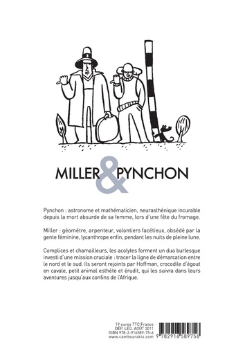 Miller & Pynchon suit les tribulations d’un duo burlesque et poétique d’arpenteurs investis d’une mission cruciale : tracer la ligne de démarcation entre le Nord et le Sud. Astronome et mathématicien, Pynchon dirige les opérations : en proie à une incurable mélancolie depuis la mort on ne peut plus idiote de sa femme, écrasée sous une meule géante lors d’une fête du fromage, sa relative distraction est compensée par le solide sens pratique de son camarade, le géomètre Miller, dont la lycanthropie handicape cependant leur quotidien. Chaque nuit de pleine lune, Miller se transforme en loup-garou : comble de tristesse, il se découvre père d’un fils qui souffre du syndrome inverse, garçon-loup ne retrouvant son apparence humaine que les nuits où son père se métamorphose. Le garçon périra tué par un chasseur en Afrique, où Miller et Pynchon sont venus observer le passage de Vénus. Entretemps, ils auront fait la rencontre de deux jeunes femmes facétieuses dont une farce sera la cause de leur brève incarcération, d’un petit crocodile d’égout, qui deviendra leur auxiliaire… Bref, ils vivront une multitude de micro-aventures fort surprenantes.
