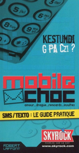 Pour parler SMS sans problème : un petit livre pratique et amusant, à mettre dans toutes les poches. Pour envoyer un message directement à partir de son portable, plus la peine de se perdre en fastidieuses circonvolutions alphabétiques : il suffit de quelques lettres, et le message est transmis, succinct et clair. "T'es occupé? " devient "TOQP ? ", la réponse "Je végète" se traduit par un acronyme expressif : "GVGT". Pour "Bonjour", "BJR" ; "Demain" prend des allures futuristes avec "2m1" et le constat quotidien "J'ai pas les idées claires" est parfaitement illustré avec le "Gpal ZIdklR ! "... En cinq chapitres, vous saurez tout sur l'art du SMS : dictionnaire d'abréviations, expressions thématiques françaises et anglaises (sur la rencontre, le sexe, l'amour, les ruptures, les insultes...), questions-réponses, smileys et dessins. Un nouveau mode d'expression et de communication... Par exemple, vous apprendrez dans le chapitre thématique consacré à l'amour : comment l'envoyer promener de manière efficace et lapidaire ? Comment lui suggérer en deux mots que vous succombez à son charme électrique ? Le SMS offre de nouvelles stratégies amoureuses promptes et inattendues : "TBL" pour "T'es belle" ; "Tumpl" pour "Tu me plais" ; "takLk1", "T'as quelqu'un ? "... et l'envoi d'une rose en @>- ; - . Retrouvez des extraits de Mobile choc sur votre téléphone mobile Wap avec Vizzavi http : //www. vizzavi. fr/home/index. jsp#