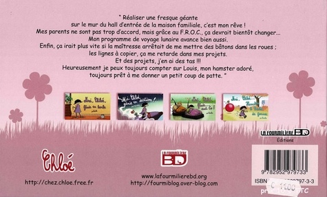 " Réaliser une fresque géante sur le mur du hall d'entrée de la maison familiale, c'est mon rêve ! Mes parents ne sont pas trop d'accord, mais grâce au F. R. O. C. , ça devrait bientôt changer... Mon programme de voyage lunaire avance bien aussi. Enfin, ça irait plus vite si la maîtresse arrêtait de me mettre des bâtons dans les roues ; les lignes à copier, ça me retarde dans mes projets. Et des projets, j'en ai des tas !!! Heureusement je peux toujours compter sur Louis, mon hamster adoré, toujours prêt à me donner un petit coup de patte. "