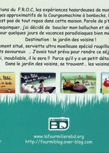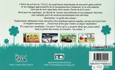"Entre les actions du F. R. O. C, les expériences hasardeuses de mon petit génie préféré et les réglages approximatifs de la Courgeomachine à bonbecks, la vie d'un hamster n'est pas de tout repos dans cette maison. Parole de p'tit Louis ! Alors pour me requinquer, j'ai décidé de boucler mon balluchon et de m'esquiver discretos pour quelques jours de vacances paradisiaques bien méritées. Destination : le jardin des voisins ! Emplacement idéalement situé, serviette ultra moelleuse spécial roupillon, nectars de fruits frais et beignets savoureux ... J'avais tout prévu pour rendre ce séjour inoubliable ! Et croyez moi, inoubliable, il le sera !! Parce qu'il y a un petit détail que j'avais oublié. Dans le jardin des voisins, se trouvent... les voisins...".