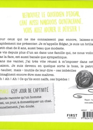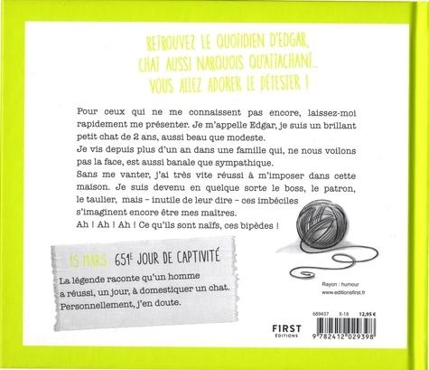 Pour ceux qui ne me connaissent pas encore, laissez-moi rapidement me présenter. Je m'appelle Edgar, je suis un brillant petit chat de 2 ans, aussi beau que modeste. Je vis depuis plus d'un an dans une famille qui, ne nous voilons pas la face, est aussi banale que sympathique. Sans me vanter, j'ai très vite réussi à m'imposer dans cette maison. Je suis devenu en quelque sorte le boss, le patron, le taulier, mais - inutile de leur dire - ces imbéciles s'imaginent encore être mes maîtres. Ah ! Ah ! Ah ! Ce qu'ils sont naïfs, ces bipèdes !