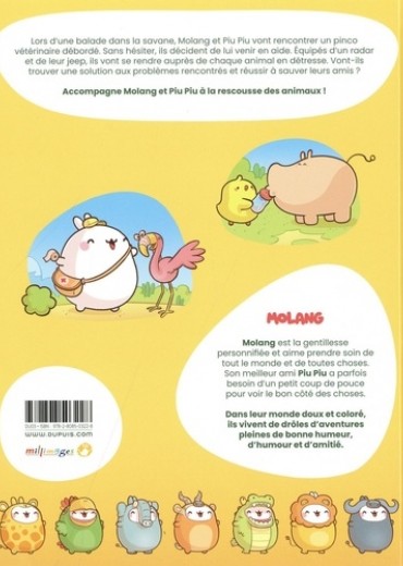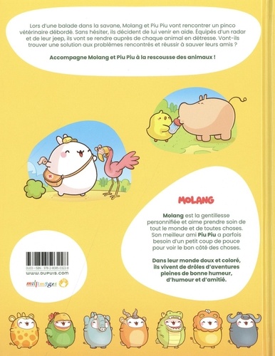 Lors d'une balade dans la savane, Molang et Piu Piu vont rencontrer un pinco vétérinaire débordé. Sans hésiter, ils décident de lui venir en aide. Equipés d'un radar et de leur jeep, ils vont se rendre auprès de chaque animal en détresse. Vont-ils trouver une solution aux problèmes rencontrés et réussir ô sauver leurs amis ? Accompagne Molang et Plu Plu d la rescousse des animaux ! Molang est la gentillesse personnifiée et aime prendre soin de tout le monde et de toutes choses. Son meilleur ami Piu Piu a parfois besoin d'un petit coup de pouce pour voir le bon côté des choses. Dans leur monde doux et coloré, ils vivent de drôles d'aventures pleines de bonne humeur, d'humour et d'amitié.