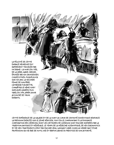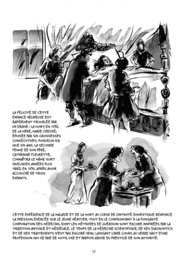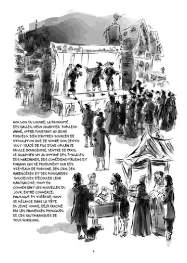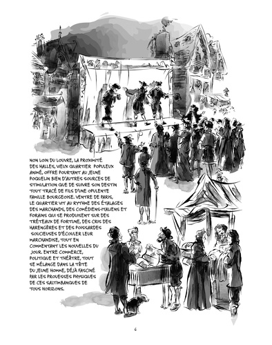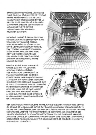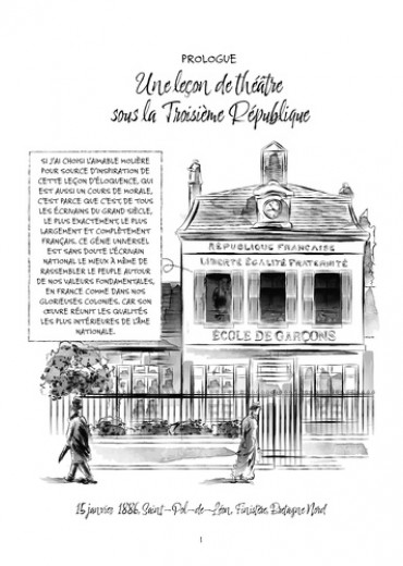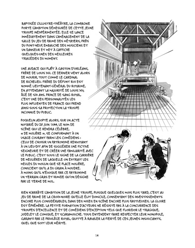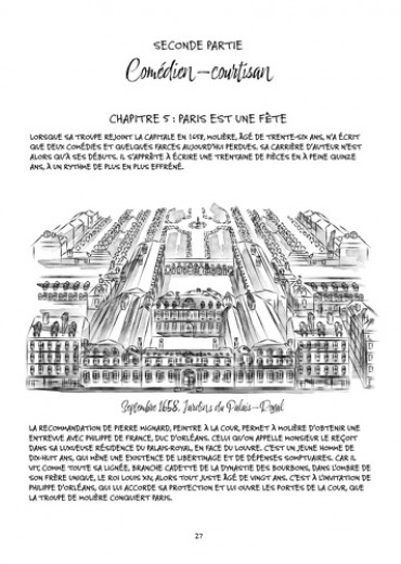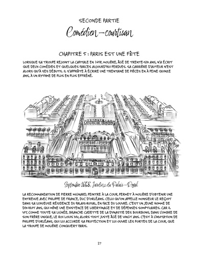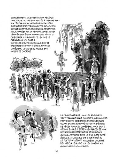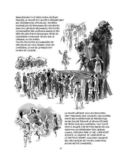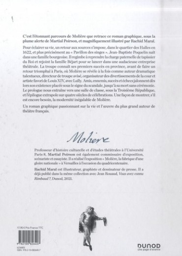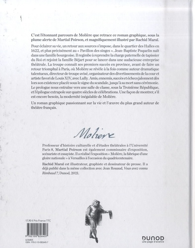 C'est l'étonnant parcours de Molière que retrace ce roman graphique, sous la plume alerte de Martial Poirson, et magnifiquement illustré par Rachid Marat. Pour éclairer sa vie, un retour aux sources s'impose, dans le quartier des Halles en 1622, et plus précisément au "Pavillon des singes". Jean-Baptiste Poquelin naît dans une famille bourgeoise. Il regimbe à reprendre la charge paternelle de tapissier du Roi et rejoint la famille Béjart pour se lancer dans une audacieuse entreprise théâtrale. La troupe connaît ses premiers succès en province, avant de faire un retour triomphal à Paris, où Molière se révèle à la fois comme auteur dramatique talentueux, directeur de troupe avisé, organisateur des divertissements de la cour et artiste favori de Louis XIV, avec Lully. Amis,ennemis, succès et échecs jalonnent dès lors son existence placée sous le signe du scandale, jusqu' à sa mort sans cérémonie. Le prologue nous entraîne vers une salle de classe, sous la Troisième République, et l'épilogue extrapole sur quatre siècles de célébrations. Une façon de montrer, s'il est encore besoin, la modernité inégalable de Molière.