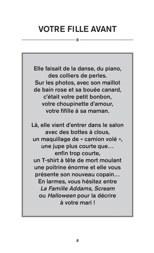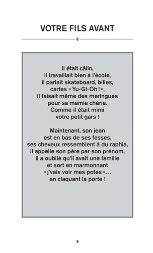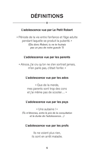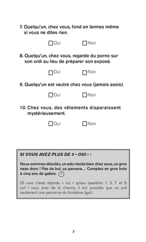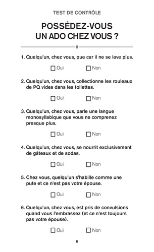 Si les parents pouvaient éviter la crise de leur ado, ils le feraient. Comme on les comprend : des emmerdements, des angoisses, des engueulades, et tout ça pendant quatre ans ! Rassurez-vous, aujourd'hui vous n'êtes plus seuls. Ce livre, écrit spécialement pour vous, va vous aider à affronter la crise sans (trop de) séquelles. Vous apprendrez à refuser à votre ado un scooter, un rat apprivoisé, une sortie en semaine et bien d'autres demandes totalement incongrues. Vous trouverez également une foule de conseils pratiques pour réveiller et bien nourrir votre ado. Vous découvrirez les sujets qu'il est préférable de ne jamais aborder, ou les révélations à garder secrètes. A tout prix.