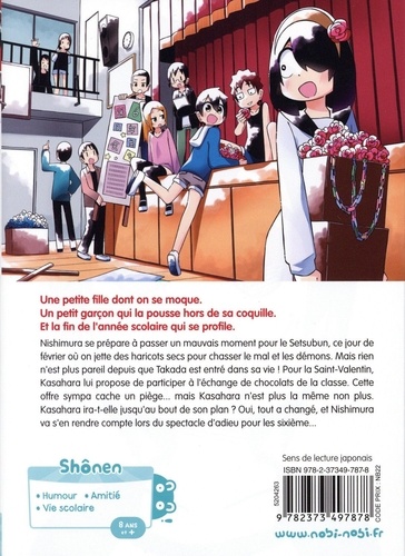 Une petite fille dont on se moque. Un petit garçon qui la pousse hors de sa coquille. Et la fin de l'année scolaire qui se profile. Nishimura se prépare à passer un mauvais moment pour le Setsubun, ce jour de février où on jette des haricots secs pour chasser le mal et les démons. Mais rien n'est plus pareil depuis que Takada est entré dans sa vie ! Pour la Saint-Valentin, Kasahara lui propose de participer à l'échange de chocolats de la classe. Cette offre sympa cache un piège... mais Kasahara n'est plus la même non plus. Kasahara ira-t-elle jusqu'au bout de son plan ? Oui, tout a changé, et Nishimura va s'en rendre compte lors du spectacle d'adieu pour les sixième...