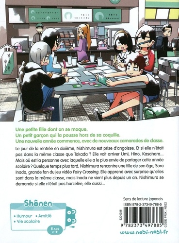 Une petite fille dont on se moque. Un petit garçon qui la pousse hors de sa coquille. Une nouvelle année commence, avec de nouveaux camarades de classe. Le jour de la rentrée en sixième, Nishimura est prise d'angoisse. Et si elle n'était pas dans la même classe que Takada ? Elle voit arriver Umi, Hino, Kasahara... Mais où est la personne avec laquelle elle a le plus envie de partager cette année scolaire ? Quelque temps plus tard, Nishimura rencontre une fille de son âge, Sora Inada, grande fan du jeu vidéo Fairy Crossing. Elle apprend avec surprise qu'elles sont dans la même classe, mais Inada ne vient plus depuis un an. Nishimura se demande si elle n'était pas harcelée, elle aussi...