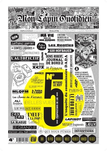CE TITRE SERA PRESENTE EN AVANT-PREMIERE SUR LE FESTIVAL D'ANGOULEME 2018 Donnez-nous, chaque trimestre, Mon Lapin Quotidien. Pour ce numéro 5, collection hiver-printemps 2018 (un an déjà ! ), c'est, comme annoncé en une : "L'Accomplissement" (de Quentin Faucompré) et "D'infimes fragments déchiquetés du monde [qui] volent entre les confettis" (L'Autofictif d'Eric Chevillard). Une fête au bord du gouffre, une danse de funambule, la célébration d'une fin du monde pleine comme un oeuf : pleine de promesses. Promesses toujours toutes tenues, puisque Mon Lapin Quotidien n'en fait JAMAIS aucune. MLQ : le quotidien qui paraît toujours par miracle.