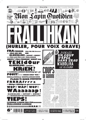 Mon Lapin Quotidien numéro 9 se consacrera exclusivement à : LA COMMODE. C'est à dire à LA COMMODE sur laquelle on trouve mon cul... . Ou pas. MLQ n'oublie JAMAIS de se dire "ou pas" dès qu'il a une idée. MLQ n'est pas le journal des lecteurs qui savent à quoi s'attendre. MLQ est le journal qui n'attend pas de savoir. MLQ est le journal d'une expérience en cours. MLQ est une entreprise qui vise à rendre visible l'imprévisible. MLQ ne tient que les promesses (mais alors : toutes les promesses) qu'il ne fait pas. MLQ réalise soudain que toute tentative de définition est vaine, incomplète, insatisfaisante. MLQ promet désormais de ne plus parler de lui-même qu'au, et seulement au : temps passé... . Ou pas. Ceux que l'on peut quand même espérer trouver dans ce miracle d'équilibre, mille fois tenté et enfin réalisé, entre le monde des mots et celui des images : David B. , Pacôme Thiellement, Denis Robert, Dominique Lestel, Lewis Trondheim, Joko, Corinne Taunay, Phileas Pym, Jean-Yves Duhoo, Vincent Pianina, Rocco, Florence Dupré la Tour, Hervé Le Tellier, Etienne Lécroart, Rudy Spiessert, Charles Berberian, Thomas Baumgartner, François Ayroles, Agnès de Cayeux, Clémentine Mélois, Dorothée de Monfreid, Killoffer, Vincent Vanoli, Denis Bourdaud, Edmond Baudoin, Eric Chevillard, Jochen Gerner, Fabio Viscogliosi, Morvandiau, Alex Baladi, Aurélie William Levaux, Christophe Levaux, Thierry Longé... et puis, et puis... 90 auteurs dans notre numéro 7. Peut-on en faire le tour ? Le doit-on ? Quelqu'un dit-il mieux ? A ces questions, une seule réponse : "NON ! "