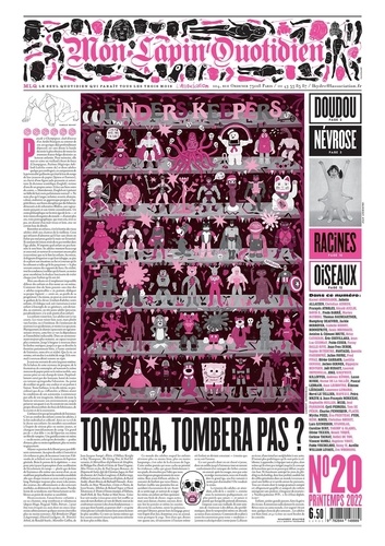 Retomber en enfance, c'est la hantise des vieux adultes rétifs aux charmes de la vieillesse. [... ] Ils auraient été mieux avisés de ne pas tomber dans l'âge adulte" , écrit Humphrey Beauvoir en couverture du journal. Cette douce et cinglante introduction (en couverture de notre numéro) résonne avec la célèbre phrase de Tristan Bernard citée par Hervé Le Tellier quelques pages plus loin dans sa rubrique Critique Constructive, co-signée avec Lécroart : "Je ne retomberai jamais en enfance, j'y suis toujours resté" . Un parfum de désobéissance, d'école buissonnière et de flagrant délit de délicatesse irradie les mots et images de ce nouveau numéro de Mon Lapin Quotidien dont la couverture et la dernière page sont marbrées d'un rose bonbon joyeux et régressif.