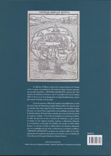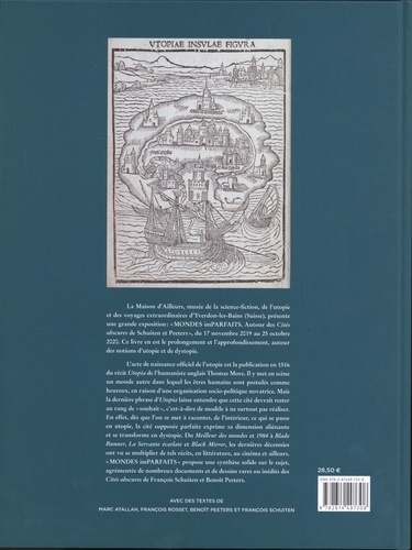 La Maison d'Ailleurs, musée de la science-fiction, de l'utopie et des voyages extraordinaires d'Yverdon-les-Bains (Suisse), présente une grande exposition : "MONDES imPARFAITS. Autour des Cités obscures de Schuiten et Peeters", du 17 novembre 2019 au 25 octobre 2020. Ce livre en est le prolongement et l'approfondissement, autour des notions d'utopie et de dystopie. L'acte de naissance officiel de l'utopie est la publication en 1516 du récit Utopia de l'humaniste anglais Thomas More. Il y met en scène un monde autre dans lequel les êtres humains sont postulés comme heureux, en raison d'une organisation socio-politigue novatrice. Mais la dernière phrase d'Utopia laisse entendre que cette cité devrait rester au rang de "souhait", c'est-à-dire de modèle à ne surtout pas réaliser. En effet, dès que l'on se met a raconter, de l'intérieur, ce qui se passe en utopie, la cité supposée parfaite exprime sa dimension aliénante et se transforme en dystopie. Du Meilleur des mondes et 1984 à Blade Runner, La Servante écarlate et Black Minor, les dernières décennies ont vu se multiplier de tels récits, en littérature, au cinéma et ailleurs. "MONDES imPARFAITS" propose une synthèse solide sur le sujet, agrémentée de nombreux documents et de dessins rares ou inédits des Cités obscures de François Schuiten et Benoît Peeters.