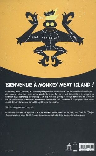 L'entreprise Monkey Meat a fait fortune et continue de prospérer en vendant des conserves de viande de singe. Sa puissance capitaliste est devenue tellement démentielle, que ses dirigeants possèdent un pays entier. Dans cette nation insulaire, l'entreprise (fondée par le mystérieux) poursuit des expérimentations scientifiques à la limite du surnaturel. Bienvenue sur l'île de Monkey Meat d'où on ne ressort pas indemne. L'univers de Juni Ba ne laissera personne indifférent. L'auteur, scénariste et dessinateur sénégalais propose une hybridation survoltée entre comics, mangas et des influences artistiques qui sortent même du domaine de la bd pour aller vers l'art contemporain. Il met ici son style au service d'une charge grinçante et sans pitié envers l'ultralibéralisme et la société de consommation dans ce qu'elle a de pire.