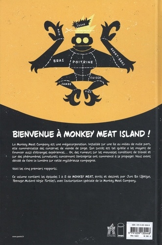 Bienvenue à Monkey Meat Island ! La Monkey Meat Company est une mégacorporation. Installée sur une île au milieu de nulle part, elle commercialise des conserves de viande de singe. ton succès est tel quelle a les moyens de financer aussi d'étranges expériences... Or, des rumeurs sur les mauvaises conditions de travail et sur des phénomènes surnaturels concernant l'entreprise ont commencé à se propager. Nous avons décidé de faire la lumière sur cette mystérieuse compagnie. Voici les cinq premiers rapports. Ce volume contient tes épisodes 1 à 5 de Monkey Meal écrits et dessinés par Juni Ba (Djeliya,Teenage Mutant Ninja Turtles), avec l'autorisation spéciale de la Monkey Meat Company.
