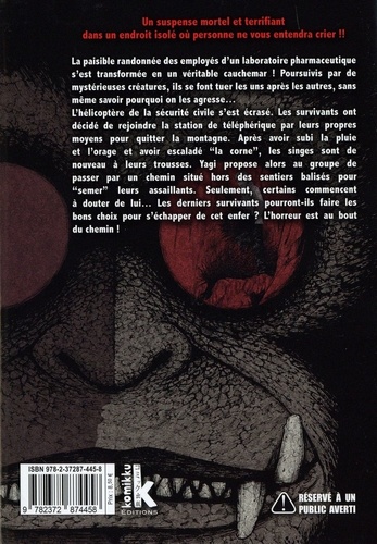 Un suspense mortel et terrifiant dans un endroit isolé où personne ne vous entendra crier !! La paisible randonnée des employés d'un laboratoire pharmaceutique s'est transformée en un véritable cauchemar ! Poursuivis par de mystérieuses créatures, ils se font tuer les uns après les autres, sans même savoir pourquoi on les agresse... L'hélicoptère de la sécurité civile s'est écrasé. Les survivants ont décidé de rejoindre la station de téléphérique par leurs propres moyens pour quitter la montagne. Après avoir subi la pluie et l'orage et avoir escaladé "la corne", les singes sont de nouveau à leurs trousses. Yagi propose alors au groupe de passer par un chemin situé hors des sentiers balisés pour "semer" leurs assaillants. Seulement, certains commencent à douter de lui... Les derniers survivants pourront-ils faire les bons choix pour s'échapper de cet enfer ? L'horreur est au bout du chemin !