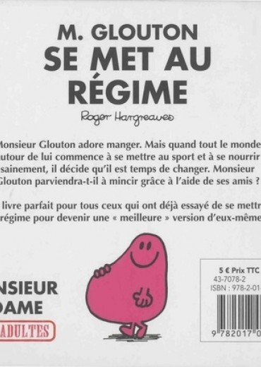 Monsieur Glouton adore manger. Mais quand tout le monde autour de lui commence à se mettre au sport et à se nourrir sainement, il décide qu'il est temps de changer. Monsieur Glouton parviendra-t-il à mincir grâce à l'aide de ses amis ? Le livre parfait pour tous ceux qui ont déjà essayé de se mettre au régime pour devenir une "meilleure" version d'eux-mêmes.