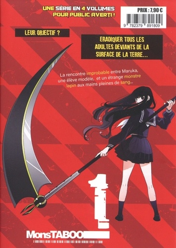 Leur mission : éradiquer tous les adultes déviants de la surface de la Terre... La rencontre improbable entre Maruka, une élève modèle, et un étrange monstre lapin aux pattes pleines de sang... Maruka est une adolescente modèle, mais le Monde dans lequel elle vit est rempli de monstres déviants et pervers qui se cachent sous une apparence d'humains normaux. Ces adultes ne montrent leur véritable apparence monstrueuse que lorsqu'ils se retrouvent seuls avec une proie. Et alors qu'elle est justement confrontée à l'un de ces " adultes ", Maruka est secourue par Mochizuki, un monstre à l'apparence de lapin, mais visiblement un peu différent des autres. Ensemble, ils vont alors s'unir pour débusquer et se débarrasser la ville de tous ces pervers qui rendent la vie des citoyens invivable... - Une série complète en 4 tomes - Une action et des combats intenses - Un duo de personnages charismatiques et attachants - Des monstres très originaux - Une thématique sur le harcèlement sexuel traité de façon allégorique - Un seinen réservé aux plus de 14 ans