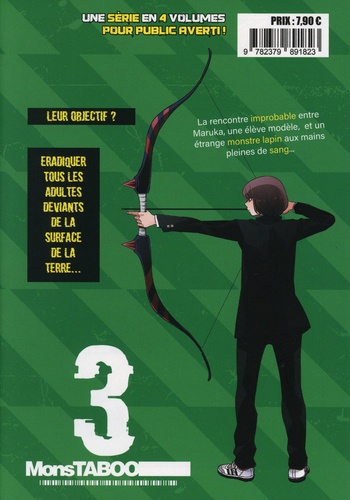 Leur mission : éradiquer tous les adultes déviants de la surface de la Terre... La rencontre improbable entre Maruka, une élève modèle, et un étrange monstre lapin aux pattes pleines de sang... Maruka est une adolescente modèle, mais le Monde dans lequel elle vit est rempli de monstres déviants et pervers qui se cachent sous une apparence d'humains normaux. Ces adultes ne montrent leur véritable apparence monstrueuse que lorsqu'ils se retrouvent seuls avec une proie. Et alors qu'elle est justement confrontée à l'un de ces " adultes ", Maruka est secourue par Mochizuki, un monstre à l'apparence de lapin, mais visiblement un peu différent des autres. Ensemble, ils vont alors s'unir pour débusquer et se débarrasser la ville de tous ces pervers qui rendent la vie des citoyens invivable... - Une série complète en 4 tomes - Une action et des combats intenses - Un duo de personnages charismatiques et attachants - Des monstres très originaux - Une thématique sur le harcèlement sexuel traité de façon allégorique - Un seinen réservé aux plus de 14 ans