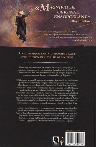 Un étrange narrateur qui n'est autre qu'un Moonshadow plus âgé et romantique nous raconte le récit initiatique interplanétaire qui l'ont mené de sa naissance d'un père extraterrestre dans un zoo galactique à son évasion et sa survie dans un univers déchiré parla guerre. Célèbre pour avoir été le premier roman graphique américain entièrement peint la bande dessinée poétique, philosophique et révolutionnaire Moonshadow est pour la première fois édité en France dans une édition de luxe avec une nouvelle introduction de son scénariste, J. M. DeMatteis, enrichie d'une section de bonus inédits présentant les croquis de recherches, les notes de travail des créateurs et des pages de script. Sublimé par les pages peintes à l'aquarelle de Jon J Muth, ce "conte de fées pour adultes" intemporel et marquant propose également le récit illustré Adieu, Moonshadow qui offre aux lecteurs un aperçu de la vie de Moon après les (més)avemures spatiales de son adolescence aux côtés de ce scélérat d'Ira. Restauré numériquement et présentant toutes les couvertures originales, ce volume comprend également des illustrations de Kent Williams et George Pratt. Savourez ce récit fantastique et intemporel que le New York Daily News a décrit comme un "poème envoûtant aux grandes qualités littéraires" et que DeMatteis lui-méme qualifie de "mélange entre David Copperfield de Dickens et Siddhartha, mais dans l'espace".