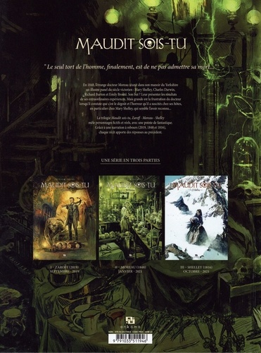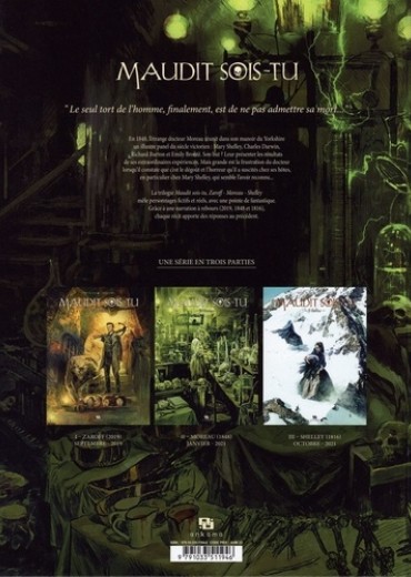 "Le seul tort de l'homme, finalement, est de ne pas admettre sa mort...". En 1848, l'étrange docteur Moreau réunit dans son manoir du Yorkshire un illustre panel du siècle victorien : Mary Shelley, Charles Darwin, Richard Burton et Emily Brontë. Son but ? Leur présenter les résultats de ses extraordinaires expériences. Mais grande est la frustration du docteur lorsqu'il constate que c'est le dégoût et l'horreur qu'il a suscités chez ses hôtes, en particulier chez Mary Shelley, qui semble l'avoir reconnu... La trilogie Maudit sois-tu, Zaroff - Moreau - Shelley mêle personnages fictifs et réels, avec une pointe de fantastique. Grâce à une narration à rebours (2019, 1848 et 1816), chaque récit apporte des réponses au précédent.