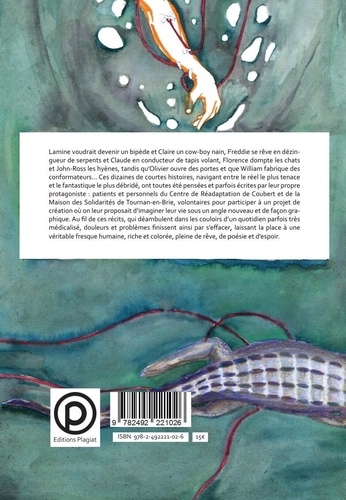 Lamine voudrait devenir un bipède et Claire un cow-boy nain, Freddie se rêve en dézingueur de serpents et Claude en conducteur de tapis volant, Florence dompte les chats et John-Ross les hyènes, tandis qu’Olivier ouvre des portes et que William fabrique des conformateurs… Ces dizaines de courtes histoires, navigant entre le réel le plus tenace et le fantastique le plus débridé, ont toutes été pensées et parfois écrites par leur propre protagoniste : patients et personnels du Centre de Réadaptation de Coubert et de la Maison des Solidarités de Tournan-en-Brie, volontaires pour participer à un projet de création où on leur proposait d’imaginer leur vie sous un angle nouveau et de façon graphique. Au fil de ces récits, qui déambulent dans les couloirs d’un quotidien parfois très médicalisé, douleurs et problèmes finissent ainsi par s’effacer, laissant la place à une véritable fresque humaine, riche et colorée, pleine de rêves, de poésie et d’espoir.