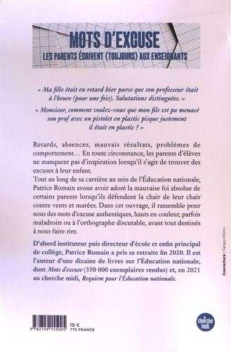 Retards, absences, mauvais résultats, problèmes de comportement... En toute circonstance, les parents d'élèves ne manquent pas d'inspiration lorsqu'il s'agit de trouver des excuses à leur enfant. Tout au long de sa carrière au sein de l'Education nationale, Patrice Romain avoue avoir adoré la mauvaise foi absolue de certains parents lorsqu'ils défendent la chair de leur chair contre vents et marées. Dans cet ouvrage, il rassemble pour nous des mots d'excuse authentiques, hauts en couleur, parfois maladroits ou à l'orthographe discutable, avant tout destinés à nous faire rire.