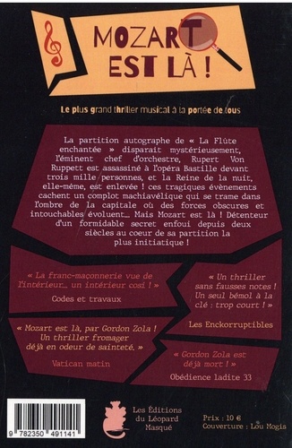 Le plus grand thriller musical à la portée de tous La partition autographe de "La Flûte enchantée" disparait mystérieusement, l'éminent chef d'orchestre, Rupert Von Ruppett est assassiné à l'opéra Bastille devant trois mille - personnes, et la Reine de la nuit, elle-même, est enlevée ! ces tragiques évènements cachent un complot machiavélique qui se trame dans l'ombre de la capitale où des forces obscures et intouchables évoluent... Mais Mozart est là ! Détenteur d'un formidable secret enfoui depuis deux siècles au coeur de sa partition la plus initiatique !