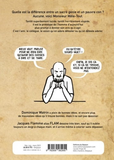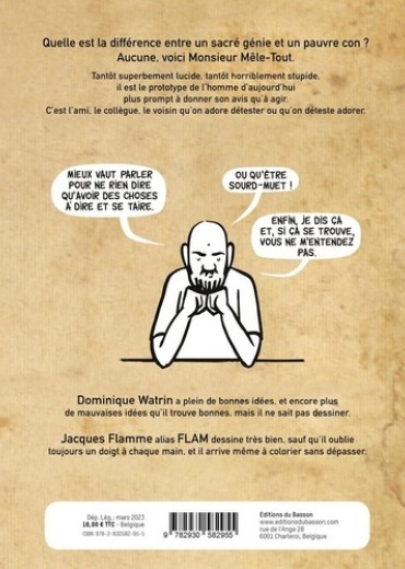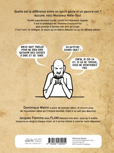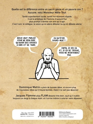 Entre Coelho et JCVD, Monsieur Mêle-Tout tord le cou aux idées reçues. Il pourfend, statistiques incontournables à l'appui, la bien-pensance molle. La mauvaise foi est bien évidemment érigée ici en règle absolue. Si l'envie de sourire, de rire ou de se moquer vous vient, chassez-la très vite car, dans notre monde de brutes, Monsieur Mêle-Tout est le seul à ouvrir la porte d'un avenir serein. Il ne fait aucun doute que, dans ces pages, nous assistons à la naissance d'un grand philosophe du vingt-et-unième sous-sol de la logique toujours prêt à nous guider sur le chemin joyeux de la vie, youpo youpi.