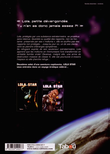 Lola, protégée par une substance extraterrestre, se prostitue sans retenue. Quantité ou qualité des rapports, rien ne l'entame : préservée par ses «mollums», elle ne souffre pas des rapports non protégés... Jusqu'au jour où, un de ses clients vient se plaindre d'étranges symptômes... Se réfugiant auprès de son souteneur extraterrestre, Lola apprend que les mollums en l'immunisant l'ont transformée en véritable bombe virale ! Devenue, malgré elle, une arme de destruction massive de classe 4, elle est poursuivie à travers l'espace où elle cherche refuge... Deuxième volet d'une aventure captivante, LOLA STAR vous entraîne dans un voyage érotique sidéral...