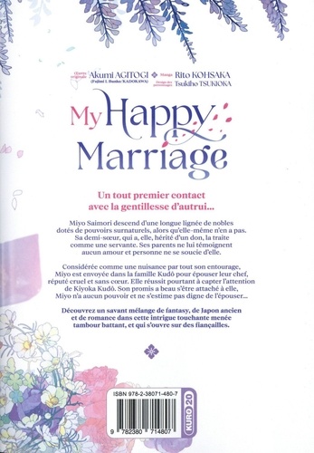 Ils redoutaient leur union, elle sera la clé de leur bonheur... Un tout premier contact avec la gentillesse d'autrui... Miyo Saimori descend d'une longue lignée de nobles dotés de pouvoirs surnaturels, alors qu'elle-même n'en a pas. Sa demi-soeur, qui a, elle, hérité d'un don, la traite comme une servante. Ses parents ne lui témoignent aucun amour et personne ne se soucie d'elle. Considérée comme une nuisance par tout son entourage, Miyo est envoyée dans la famille Kudô pour épouser leur chef, réputé cruel et sans coeur. Elle réussit pourtant à capter l'attention de Kiyoka Kudô. Son promis a beau s'être attaché à elle, Miyo n'a aucun pouvoir et ne s'estime pas digne de l'épouser... Découvrez un savant mélange de fantasy, de Japon ancien et de romance dans cette intrigue touchante menée tambour battant, et qui s'ouvre sur des fiançailles.