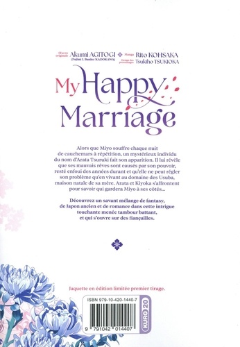 Ils redoutaient leur union, elle sera la clé de leur bonheur... Le T5 aura droit à une édition premier tirage comprenant une jaquette réversible ! Alors que Miyo souffre chaque nuit de cauchemars à répétition, un mystérieux individu du nom d'Arata Tsuruki fait son apparition. Il lui révèle que ses mauvais rêves sont causés par son pouvoir, resté enfoui des années durant et qu'elle ne peut régler son problème qu'en vivant au domaine des Usuba, maison natale de sa mère. Arata et Kiyoka s'affrontent pour savoir qui gardera Miyo à ses côtés... Découvrez un savant mélange de fantasy, de Japon ancien et de romance dans cette intrigue touchante menée tambour battant, et qui s'ouvre sur des fiançailles.