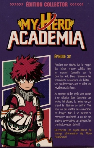 Pendant que Hawks bat le rappel des héros encore valides tout en menant l'enquête sur le One for All, Deku rencontre les précédents détenteurs de l'alter ! Ses prédécesseurs ont en effet une révélation a lui faire... Au moment où les civils sont invités à se réfugier clans l'enceinte des lycées héroïques, le jeune garçon prend la décision de quitter Yuei pour ne pas mettre ses camarades en danger. Mais il va bientôt se retrouver confronté à un de ses anciens adversaires car, dehors, les criminels évadés rôdent !