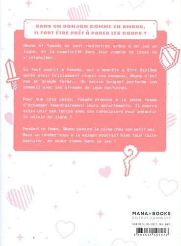 Dans un donjon comme en amour, il faut être prêt à parer les coups ! Akane et Yamada se sont rencontrés grâce à un jeu en ligne, et la complicité dans leur couple ne cesse de s'intensifier. Si tout sourit à Yamada, qui s'apprête à être diplômé après avoir brillamment réussi ses examens, Akane n'est pas en grande forme... Un voisin bruyant perturbe son sommeil avec ses streams de jeux nocturnes. Pour que cela cesse, Yamada propose à la jeune femme d'échanger temporairement leurs appartements. Il pourra ainsi unir ses forces avec ses coéquipiers pour anéantir le voisin en ligne ! Pendant ce temps, Akane savoure le calme chez son petit ami. Mais un rendez-vous à la maison pourrait bien tout faire basculer, en amour comme dans le jeu !